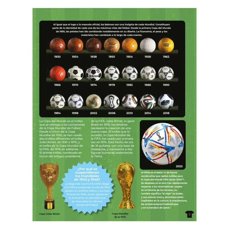 Las copas utilizadas a lo largo de la historia, los logotipos de todos los torneos disputados y la evolución de los balones utilizados desde 1930. Y fantásticas PEGATINAS de las camisetas de las selecciones nacionales para completar la información del libro